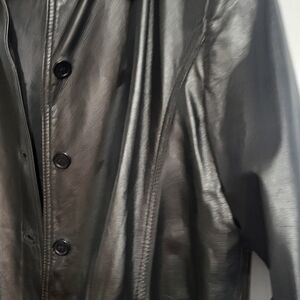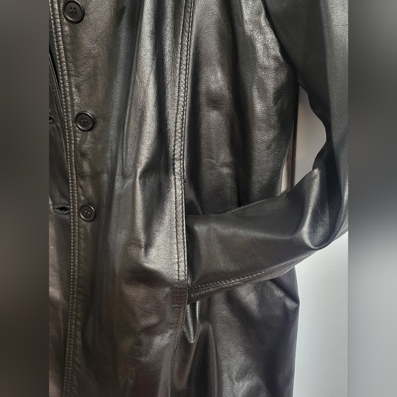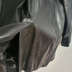 Elevate your style with this sleek black leather jacket. Perfect for any occasion, it offers both comfort and sophistication. The p to p is 21" and length is 33.5"