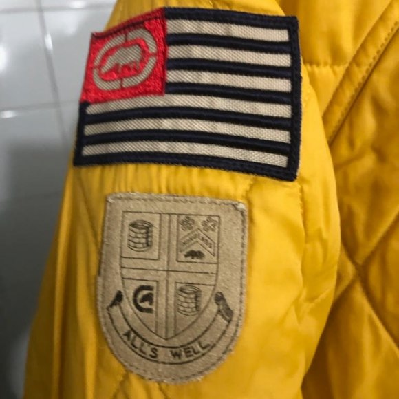 SATIN ECKO JACKET TWO IN ONE JACKET. BLACK SATIN ON ONE SIDE, QUILTED YELLOW COLORWAY ON THE OTHER. ALOT OF DETAIL PATCHES AND EMBRODERY ON THE JACKET THAT MAKES IT ONE OF A KIND