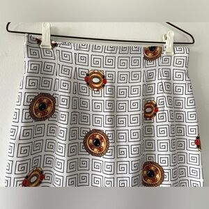 Very cool retro spiral black & white patterned slim fitted pencil skit with ornate brooch style graphics, lined and soft wrinkle resistant fabric. Excellent condition, no signs of wear. No size or fabric tag, appears to fit women's medium.