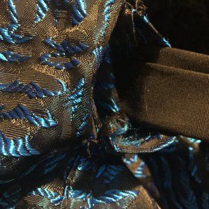 Majestic Pattern Jacket, Lightweight Size S, Color Black, Blue, 100% Acetate, Breast Pocket, Front Pockets, Sleeve Black Cuff, Closure Black Tie Stap, Pocket Trim Small Spot, Loop Pulling but in Good Condition, Made in Canada, Beautiful Jacket, Great Look, Great Fitting.