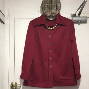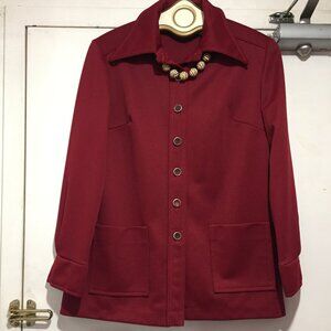 Mr. K. Casual Long Sleeve Pantsuit, No Label Fit Size M, Color Red, 100% Polyester, Shirt/Jacket, Front Pockets, Closure Button Down, Pant High Elastic Waist, Pant Waist Needs Elastic but in Good Condition, Made in Canada, Relaxed Fit, Great Look, Great Fit.
