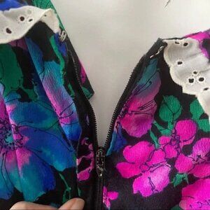Beautiful vintage 60s - 70s? bright Hawaiian floral Design with black, pink, green embellished with eyelet lace trim.
