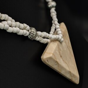 Vintage Marble Stone Triangle Pendant with Beaded Necklace. 16" in length. each side of triangular pendant measures 2.5". marble is cool to the touch, with a small chip on edge. nice weight. loop and marble bead closure. a beautiful statement piece. in wonderful vintage condition. costume jewelry.