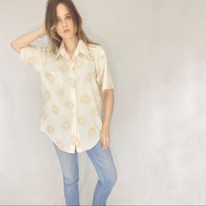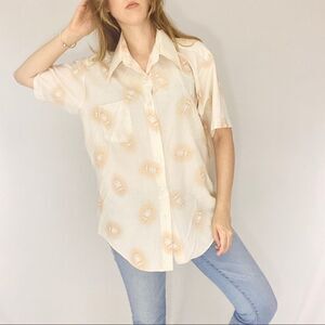 Vintage 1970s men’s polyester cotton blend geometric print casual button-down shirt great vintage condition slight wearing to pattern at fold of collar pictured.