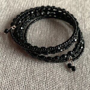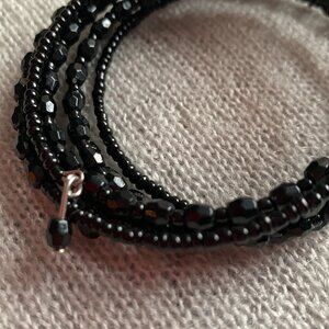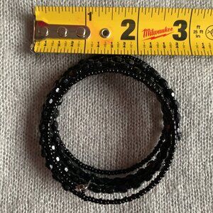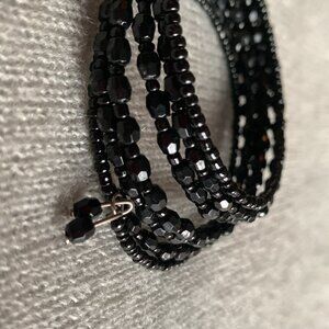 Memory wire beaded bracelet made with layers of memory wire, it has mix of different sizes of multi facet black beads. Nice little detail at each end.