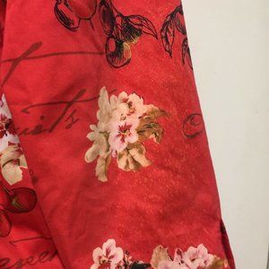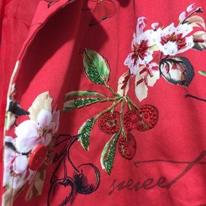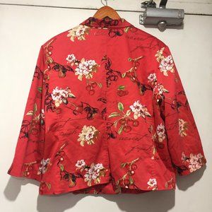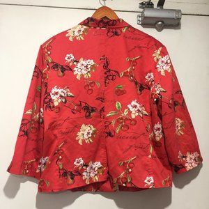 Vintage Nancy Bolen Printed Jacket, Lightweight Size 14, Multicolor Cherry, and Floral Print, 67% Cotton, 29% Nylon, 4% Spandex, Lining, Shoulder Pads, Three Quarter Split Sleeves, Front Small Embellished, Front Small Hole but it is in Good Condition, Great Jacket, Great Look, Great Fitting.