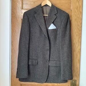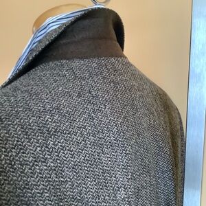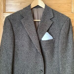 Be the envy of the town in this vintage pure new wool tweed blazer. Classic tailoring with luxurious details, this three-button, three-pocket jacket features notched lapels, a double back vent and full lining. Shades of black, brown and tan contribute to a warm neutral colour palette.