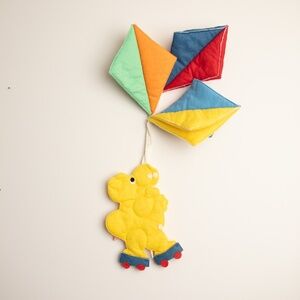 80s vintage plush nursery wall hanging featuring A Dino holding on to colourful kites.