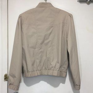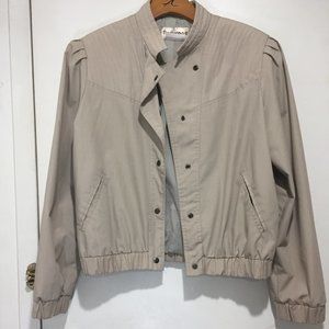 Vintage Pariscope Cropped Jacket, No Label fit Medium, Color Tan, Lining, Pleated Shoulder Pads, Side Pockets, Elastic Cuffs and Bottom, Closure Snap Buttons, in Good Condition, Vintage Casual Lightweight Jacket, Great Look, Great Fitting.