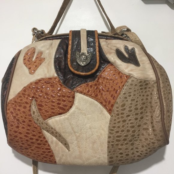 Vintage Patchwork Handbag, This is an Alligator Leather Handbag, No Label, Two Straps, Small Strap is a Bit Worn, but the Long Strap can Remove, inside is Roomy with Zipper Pocket, Closure Flap Snap Button, it is in Good Condition, It is a Beautiful Handbag, Medium Size.