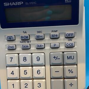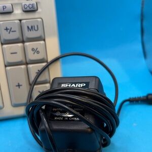 Sharp EL-1701C printing calculator with adapter. Features a blue and white design.