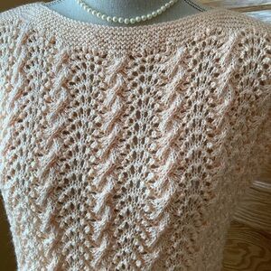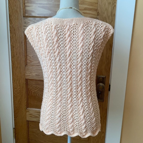 Elegant vintage peach cable knit sleeveless vest top. Features a delicate pattern with a scalloped hem. No fabric tag, but feels very much like cotton. Beautifully crafted.