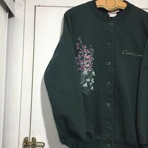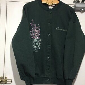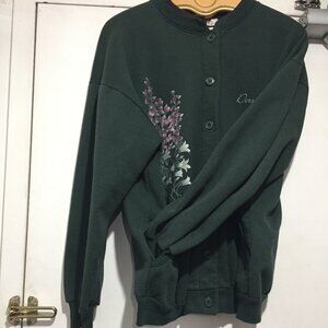 Quality Goods Sweatshirt, Lightweight Size XL, Color Green, Purple, 50% Cotton, 50% Polyester, Flower Graphic, Side Pockets, Closure Button Down, Color Faded, in Good Condition, Made in Canada, Relaxed Fit, Great Look, Great Fit.
