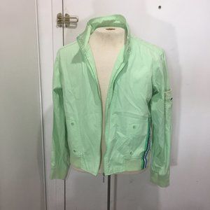 Vintage Reebok Lightweight Jacket, Size L, Color Green, 100% Cotton, Right Side Zipper Pocket, Left Side Multicolor Stripe Zipper Pocket, Left Sleeve Embroidered Reebok on Small Pocket, Elastic Waistband, and Cuffs, Closure Zipper, Neck Small Strap Snap Buttons, in Good Condition, Beautiful Lightweight Jacket, Great Look, Great Fitting.