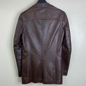 Calling all tall bros!! This funky brown leather jacket is made of amazing quality and very stylish! Has been leather cleaned in my care and is ready to wear. Has buttons on the sleeves for design but are non functional. Would look great with a button down and dark denim.