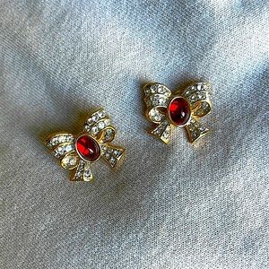 Lovely Ruby cabochon bow pierced earrings. Pierced, approx 1 “. 30 tiny pavé stones. Real rich red colour. Feminine and classic.