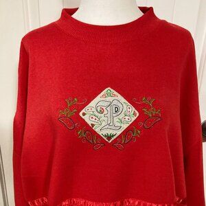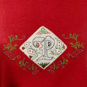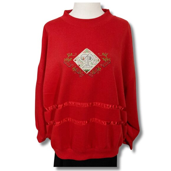 Wonderfully cozy and cute as a button, this terrific vintage plus-size red sweatshirt with its stylish letter P monogram applique, coupled with both floral and paisley stitching, is an eye-catching piece that suits the chilly months to a tee! ๐