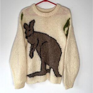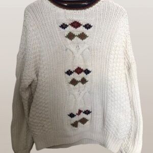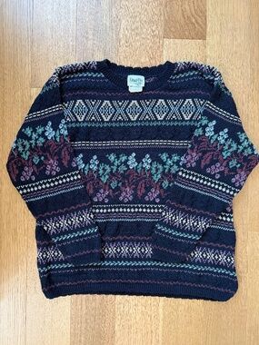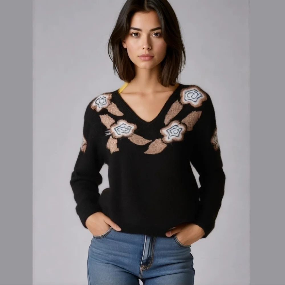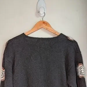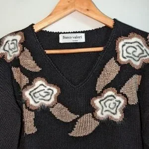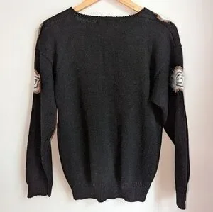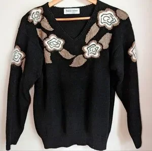 VINTAGE Retro Black & Floral Embroidery Crewneck Knit Sweater Size Medium