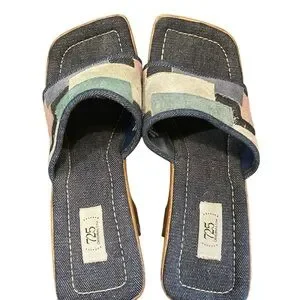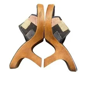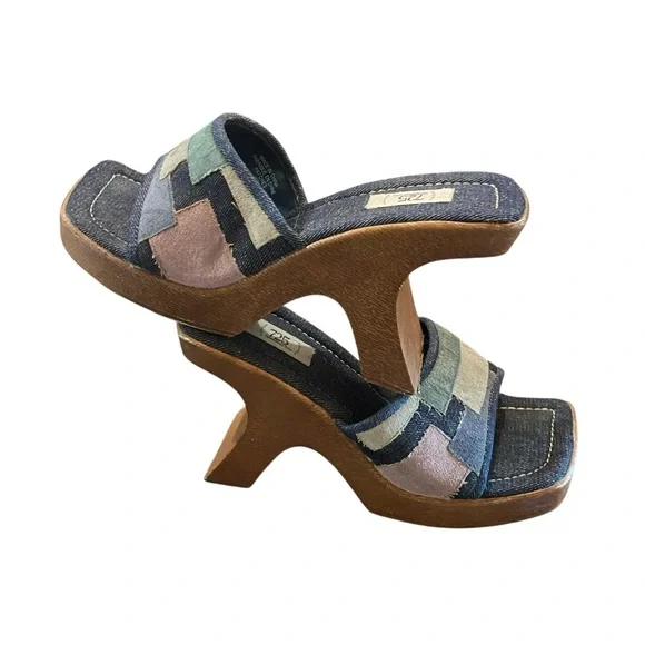 Vintage 725 Originals platform sandals. Wood grain plastic with denim and suede.