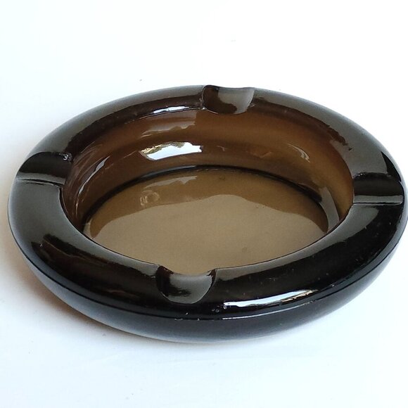 Vintage 1950s or 60s small round dark smoky green glass ashtray with four cigarette rests