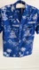Blue and white vintage Hawaiian shirt by Royal Creations Hawaii. Features a design that includes the Hawaiian Islands, ships and palm trees. Front pocket, button front, short sleeves. 65% polyester/35% cotton blend, made in Hawaii.