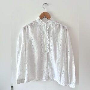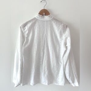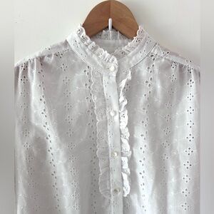 This charming vintage white blouse features delicate eyelet embroidery with romantic ruffle details at the collar and down the button placket. Slightly puffed sleeves and feminine cuffs add a soft, boho touch, perfect for pairing with denim or floaty skirts.