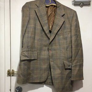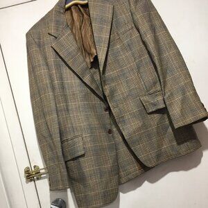 Sayvette Men's Shop Pantsuit, No Label Fit Size M, Color Brown, Blue, Tan Plaid, 100% Pure Virgin Wool, Partial Lining, Breast Pockets, Front Pockets, Inside Pockets, Shoulder Pad, Back Vent, Closure Buttons, Back Small Rip, Repair and Dry Clean before Selling, Great Suit, Great Look, Great Fitting.