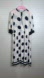 Has a key hole with a faux front wrap in the front. Slight puff sleeves that button at the cuff, and a beautiful flowing polka dot design. Last picture shows signs of wear.