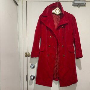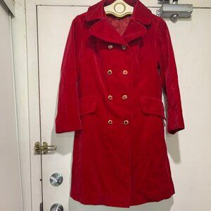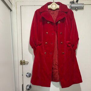Surrey Classics Long Coat, Missing Size Tag, Fit Size S, Red Velvet, 100% Cotton, Lined, Side Pockets, Back Small Strap Buttons, Double Breast Buttons Closure, Small Damaged Button Holes, it has a Little Musty Odour, in Good Condition, Made in Canada, Formal/Casual, Great Look, Great Fit.