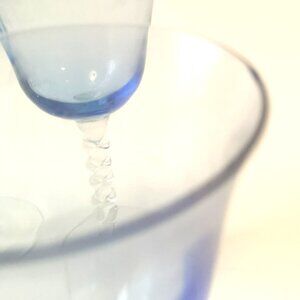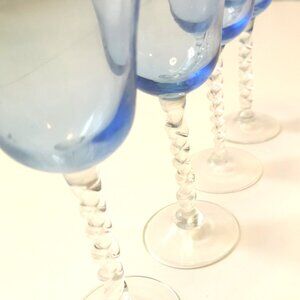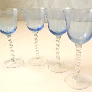 Vintage Set of 4 Hand-Blown Blue & Clear Twisted Stem Wine Glasses / Goblets