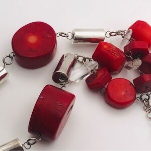 Large slices of red branch coral, clear rock Crystal and sterling sliver tube beads and chain. Bottom of the tube beads all stamped 925. There is some minor dents on some of the tube beads but not very noticeable. Unique statement necklace, long strand with short strand at the front center. No clasp, fits over your head!