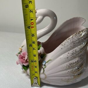This elegant swan ceramic figurine features delicate pink and white hues with beautiful floral accents.