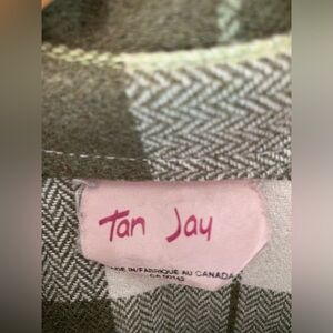 Vintage zip up Tan Jay Jacket, collared with button closure at the bottom and top of zipper. Elasticized hem and cuffs. Poly, acrylic and wool blend. Light weight, easy to throw over jeans and Tee to complete an outfit.