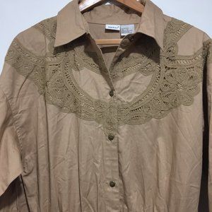 Vintage Together Maxi Dress, Size 14, Color Tan, 100% Cotton, Long Sleeves Swing Dress, Front Embroidered, Side Pockets, Elastic Waist, Closure Buttons, in Good Condition, Beautiful Thick Cotton Maxi Dress, Great Look, Great Fitting.