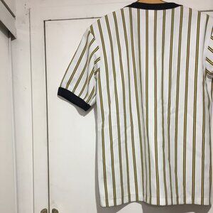 Torrez MLB Pirates Jersey, Lightweight Size S, Color Cream, Blue, Yellow Stripe, Neck, and Sleeve Blue Trim, 100% Polyester, Logo Pirates, V-Neck Pullover, Good Condition, Unisex Relaxed Fit, Great Look, Great Fit.
