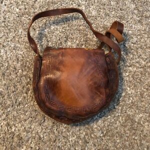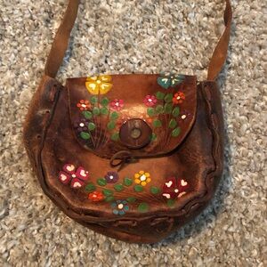 This is a nice vintage hand tooled and painted saddle bag, handbag or purse. It is well made with nice and thick leather. Nicely crafted and tooled with hand painted flowers. The fastening is a leather string which wraps around a wooden button. The inside has one large compartment that shows wear.