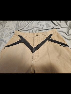 Beige cargo pants with bold black chevron contrast panels. Multiple secure pockets for everyday carry. Comfortable straight fit for reliable all-day wear. Beige and black styling offers a modern utility look.