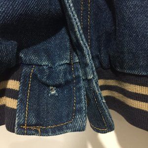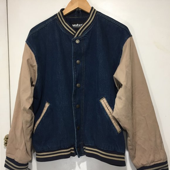 Vintage Veltex Denim Jacket, Thick Denim Jacket Size M, Color Blue, and Tan,100% Cotton, Lining, Side Pockets. Closure Snap Buttons, Bottom Button is Missing, the Sleeves have a small Spot, and Cuffs Stretched a little but it is in Good Condition, Denim Bomber Jacket, Great Look, Great Fitting.