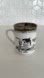 Vintage souvenir mug depicting landmarks in Vancouver, BC. Cream colour with black design and brown and black speckle glaze around the top of the mug. Includes an orca, Vancouver Aquarium, Gastown, Stadium, Lions Gate Bridge, Capilaino Suspension Bridge, Seabus. Stamped Japan on the bottom.
