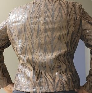 Vintage vex Brown and dark brown faux leather Blazer Jacket. 100% polyester gorgeous for that chicky boss girl look. Adorned with a beautiful and bold vintage button ,has a very beautiful vintage snap clossure ❤️.