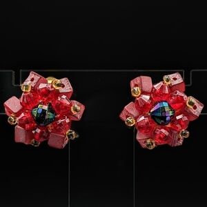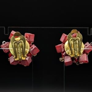 VINTAGE W GERMANY Red Square Bead Cluster Earrings w/ Black Faceted AB - CLIP