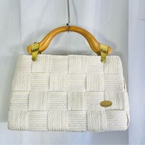 VINTAGE WHITE CREAM WOVEN BAG SUMMER WOODEN HANDLE HANDBAG MADE IN ITALY