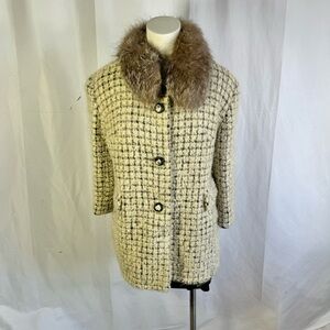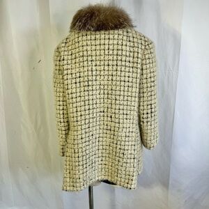 VINTAGE WOOL TWWED TRENCH COAT VINTAGE FUR VOAT CREAM BLACK PLAID PATTERN S