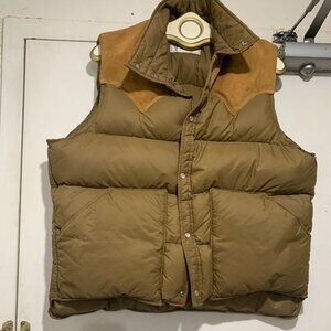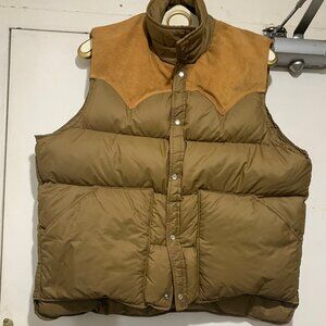 Woolrich Lightweight Vest, No Fabric/Size Tag, Fit Size L, Color Tan, Nylon Textured, Genuine Leather, Lined, Down Filled, Closure Snap Button Down, Good Condition, Puffer Vest, Great Look, Great Fit.