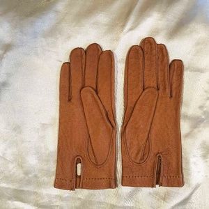 This is a pair of vintage caramel colored unlined wrist length leather gloves with vent holes on the back of the hand and fingers. These gloves have no size tag. but per measurements they are size 6 3/4. They have a Simpson store tag. They are in good condition with no damage or signs of use.