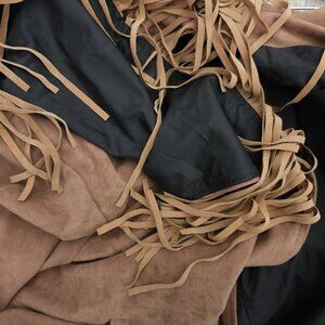Made in USA. Faux suede with embroidered horses on the back, between the shoulder blades. Fringe is on both the front and the back! Front side slip pockets.
