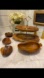 Beautiful vintage wooden serving set featuring a two-tier tray and four small bowls in assorted fruit-inspired shapes. This 5-piece set is perfect for serving snacks, appetizers, or as a beautiful decorative accent for your kitchen or dining space.