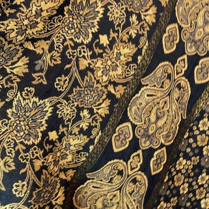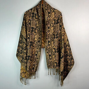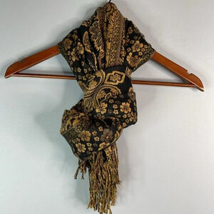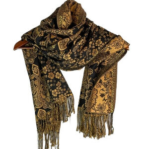 Women’s stunning camel brown black Vintage floral weave scarf with Metallic Gold threading. Fringed ends.