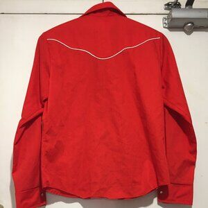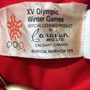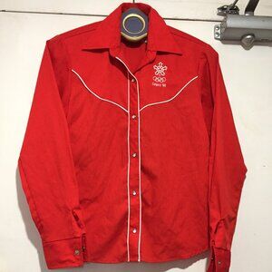 Caravan MFG. LTD. Calgary, Canada Shirt, Lightweight Size 12, Color Red, White Trim, 65% Polyester, 35% Cotton, Embroidered Calgary 88, Closure Snap Button Down, Back Small Spot, Good Condition, Great Shirt, Great Look, Great Fitting.