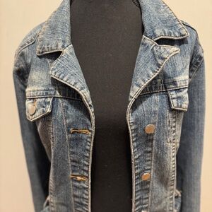 It has a flattering belted waist that cinches you in, a button-down front, and two large front pockets. The medium wash denim has a cool, distressed look that adds to its vintage charm. This is a versatile piece that can be worn as a jacket or a stylish coat dress.